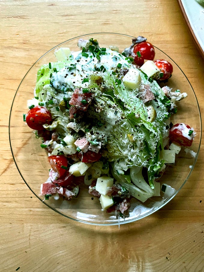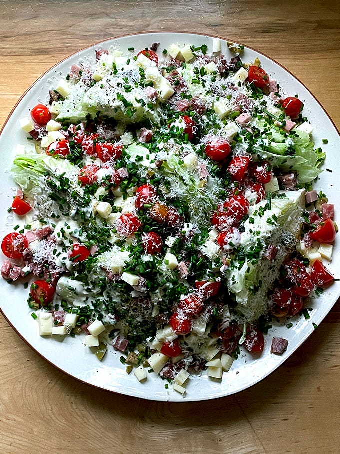 I had one blurry photo to consult along with my foggy memory, clouded by the overwhelming charm of the restaurant, the company of one of my oldest friends, and the excitement of being away from home. Google searches provided little help, so I stuck to the online description, making in the end a romaine wedge salad topped with all of the classic antipasto cured meats and cheeses dressed in what our server that evening described as “a creamy Italian dressing.”