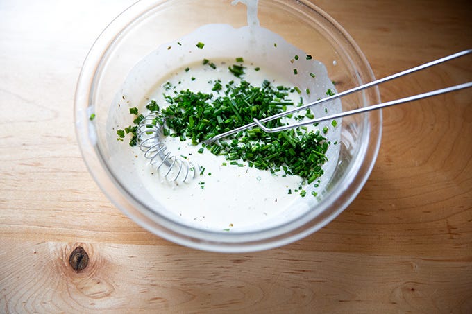 To make the dressing, whisk together all of the ingredients except the water and the chives. If the dressing is thick, stir in the tablespoon of water to thin. Stir in the chives. Taste; adjust seasonings. Refrigerate until ready to use.