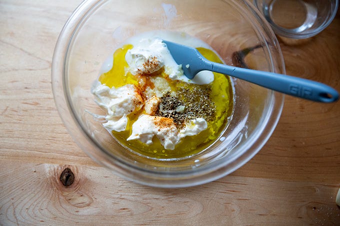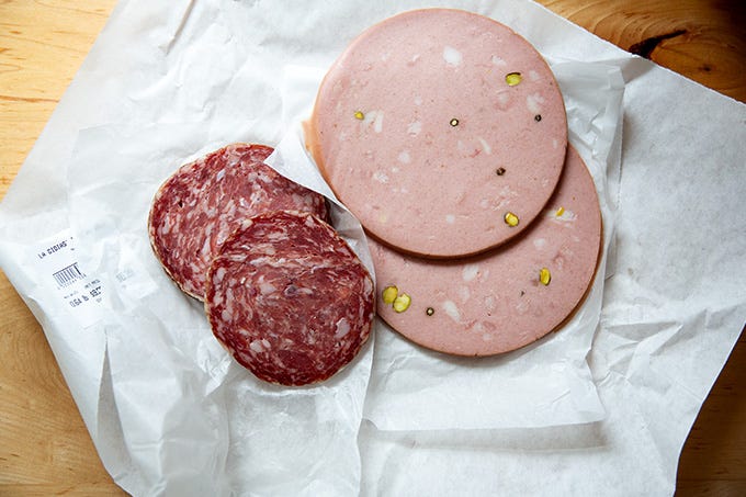For the mortadella and soppressata, ideally you start with a slice roughly ¼-inch thick. Most grocery stores sell very thinly sliced soppressata, and you of course can use that, but check with the deli counter or visit an Italian deli to get a thicker slice. Local friends: La Gioia’s in Schenectady is my favorite deli for these ingredients.
