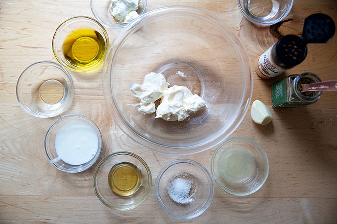 To start, you’ll want to make Emily’s dressing, a mix of mayonnaise, sour cream, buttermilk, fresh lemon juice, vinegar, garlic, and some seasonings. To balance all of the salty elements of the salad, I’ve added a small amount of honey to the dressing.