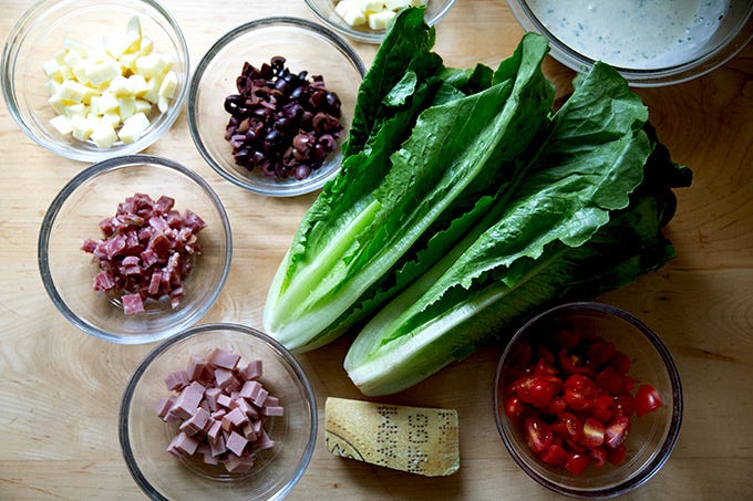 I had never made a creamy Italian dressing, so I searched the Department of Salad’s archives and found Emily’s recipe for Not Even Remotely Italian Creamy Italian Salad Dressing, which worked perfectly — it’s creamy, of course, but also light with a good amount of acidity, and I found the combination of it with all of the salty bits of meat, cheese, and olives as well as the crisp romaine and fresh tomatoes to be completely irresistible.