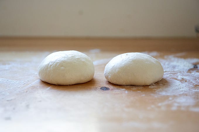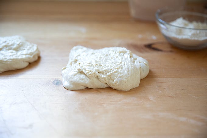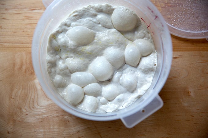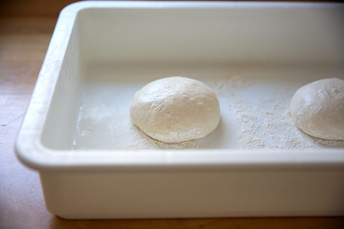As you will see, upon removing the dough from the fridge, it looks slack, wet, and sticky — not unlike the two-week-old Detroit-style pizza dough — but, as you cannot see, it smells fine. And once it is balled up, it performs nearly as well as two- or three-day-old dough (which I find to be the sweet spot for optimal bakes).