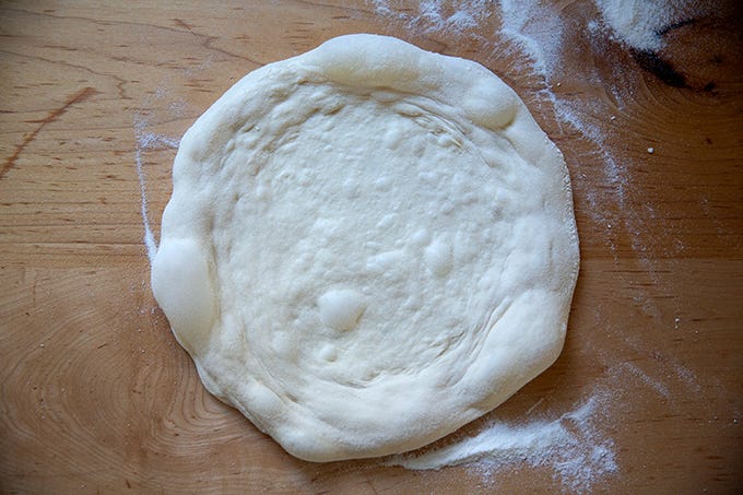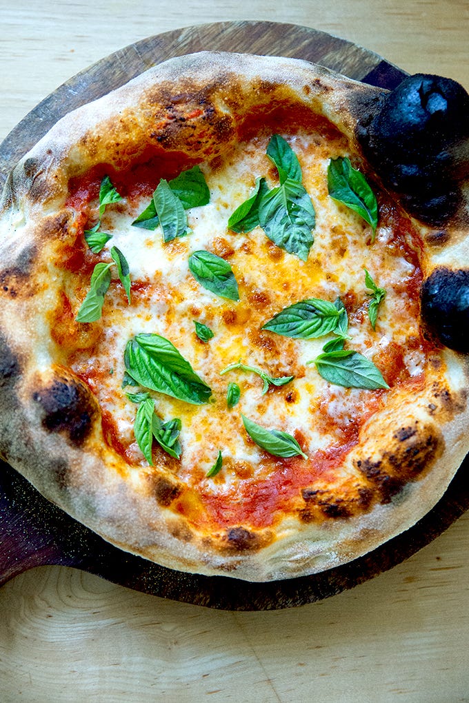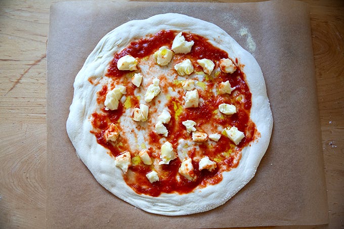 Here I’ve made a simple Margherita: a few tablespoons of No-Cook Tomato Sauce, 3 ounces low moisture, whole milk mozzarella (Calabro is my preference), extra-virgin olive oil, flaky sea salt.