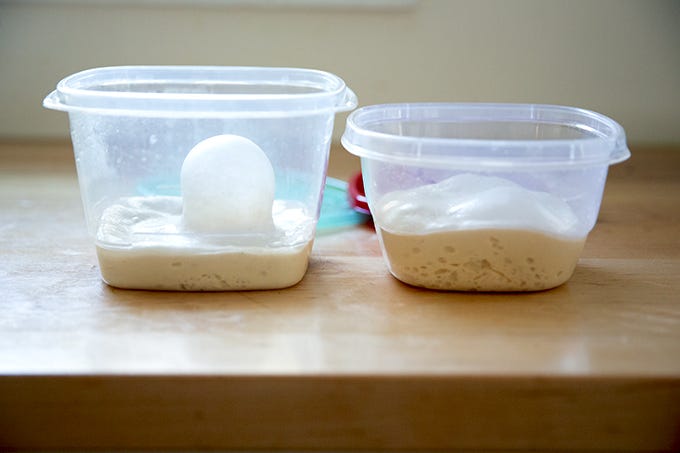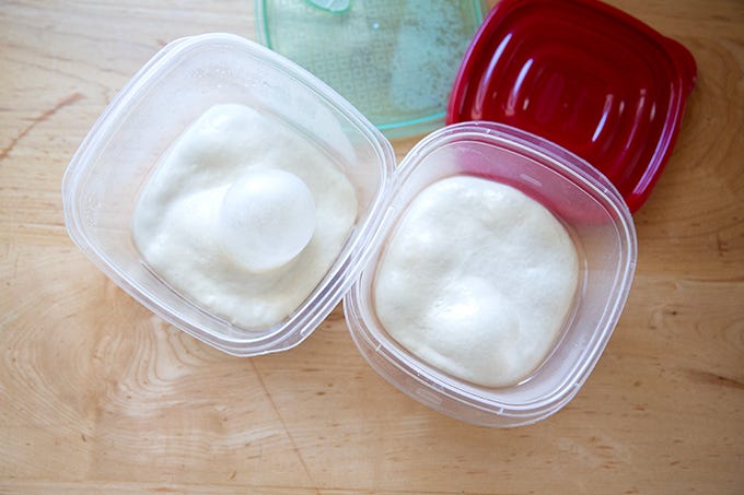 Here are two containers of Neapolitan-style dough that have been in the fridge for 9 days: