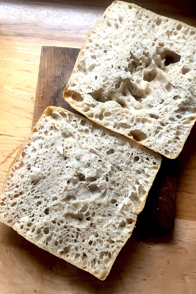 Encouraged by many successful bakes with one-week-old (or older) dough, I decided to see how this two-week-old dough would perform. I pressed it into a 9-inch baking pan, drizzled it with olive oil, and let it rest for 4 hours before dimpling it and baking it as I would focaccia.