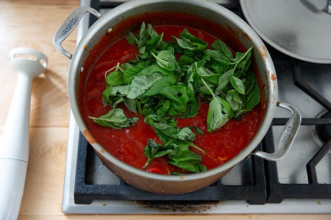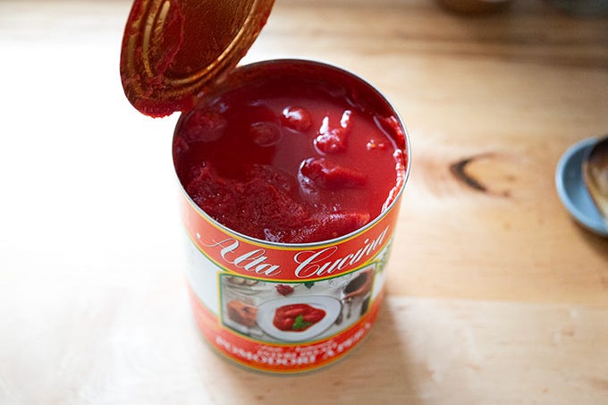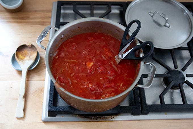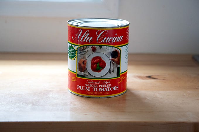 The recipe I’ve included below can be made with four 28-ounce cans of whole peeled plum tomatoes — I love La Valle and Di Napoli — or one #10 can, should you be able to get your hands on one.
