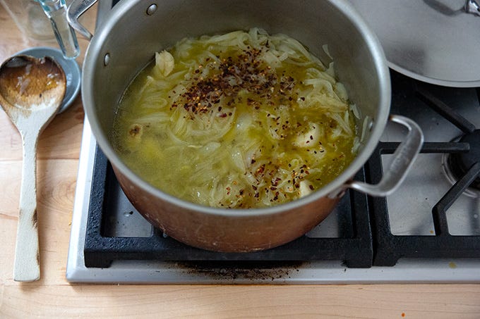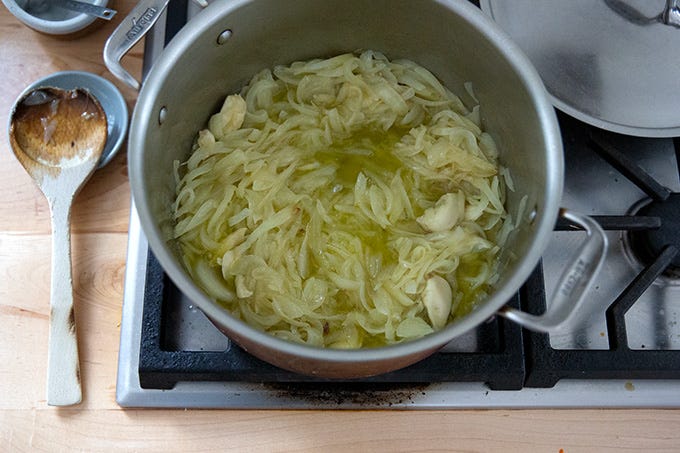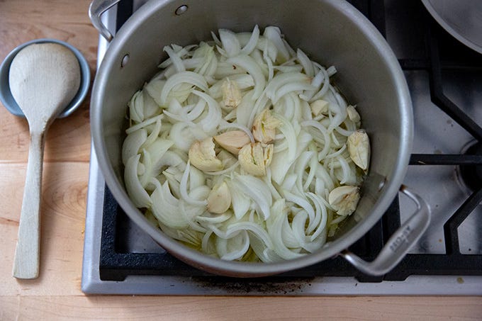 This recipe starts by sweating 8 cups of onions and 1 head of garlic in olive oil…
