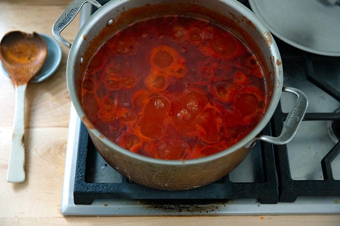 Even more exciting than learning I could actually get my hands on these beloved tomatoes, was learning that each #10 can cost only $6.60. I drove home that day with half a dozen #10 cans of the Stanislaus “Alta Cucina" (whole peeled plum tomatoes), the product I had heard mentioned the most on the podcast, and upon returning home, I made a quadruple batch of my favorite cooked tomato sauce recipe.