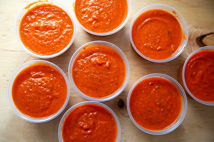 Friends, if you find yourself holed up this weekend avoiding the cold or rain or overall crummy February elements, may I suggest you make a large batch of tomato sauce? To spoon over a Sicilian-style pizza or next week’s tomato pie (see below)? Or to freeze for a future date?